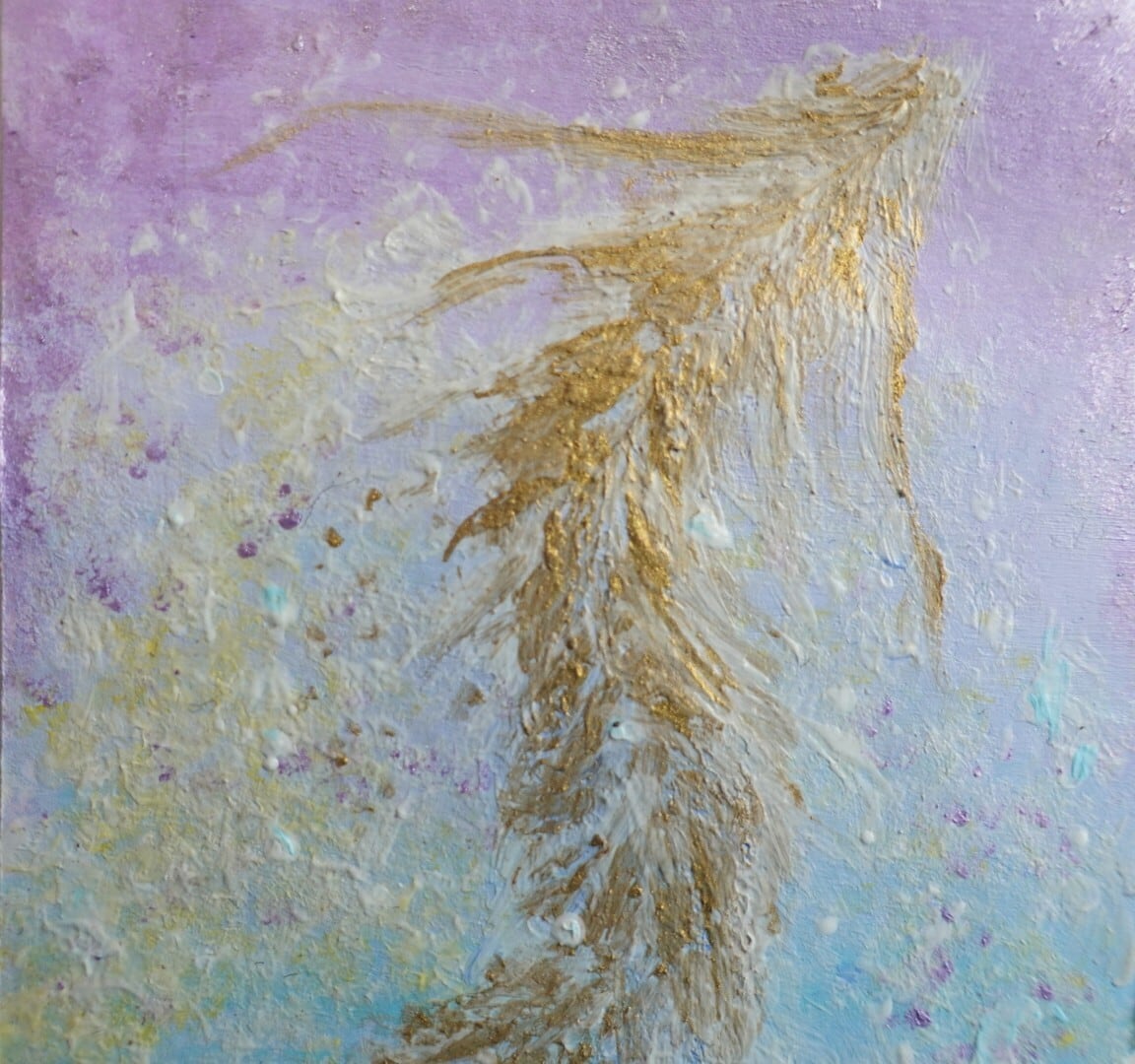 ● 金のアクリル絵の具を使用していますので、角度によって美しく輝きます。小さく優しい色合いですが存在感のある絵です。家のお守り画としていががでしょうか。